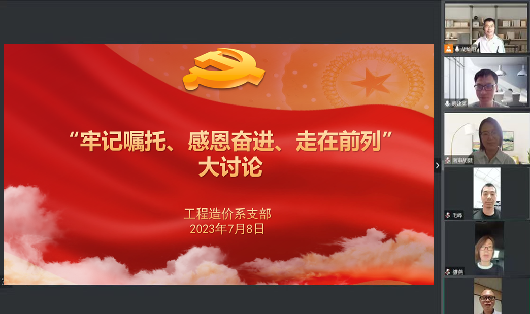 为学习贯彻习近平新时代中国特色社会主义思想,贯彻落实习近平总书记关于江苏工作重要讲话指示精神,7月8日,工程审计学院工程造价系党支部组织开展了“牢记嘱托、感恩奋进、走在前列”大讨论线上视频会议,支部全体党员参加交流研讨,会议由支部书记胡灿阳主持。