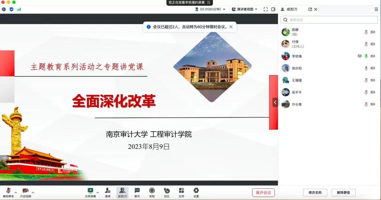 为进一步贯彻落实习近平新时代中国特色社会主义思想主题教育,8月9日上午,工程审计系支部在线上开展“全面深化改革”专题党课学习会。工程审计学院党总支副书记(主持)徐庆阳,工程审计系全体党员参加会议。会议由党支部书记付倩主持。