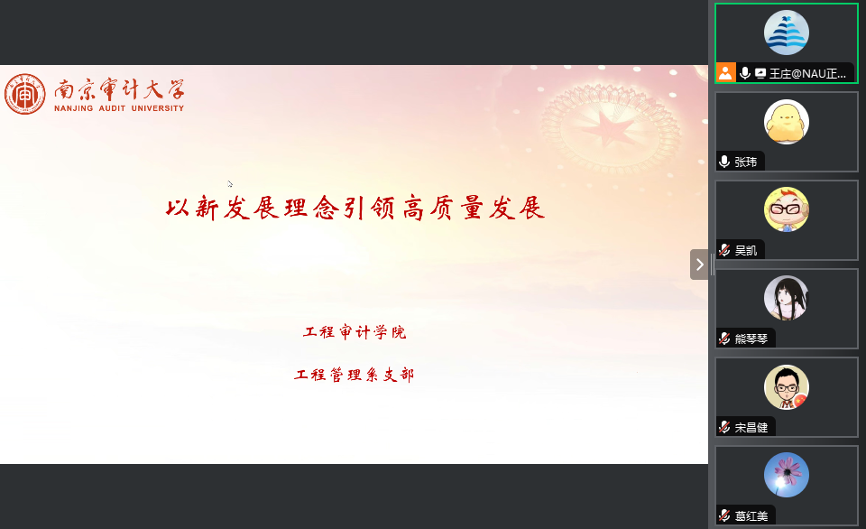 为进一步贯彻落实习近平新时代中国特色社会主义思想主题教育,8月9日上午,工程管理系支部在线上开展“以新发展理念引领高质量发展”专题学习。工程管理系支部全体教工党员参加会议,会议由支部书记王庄主持。