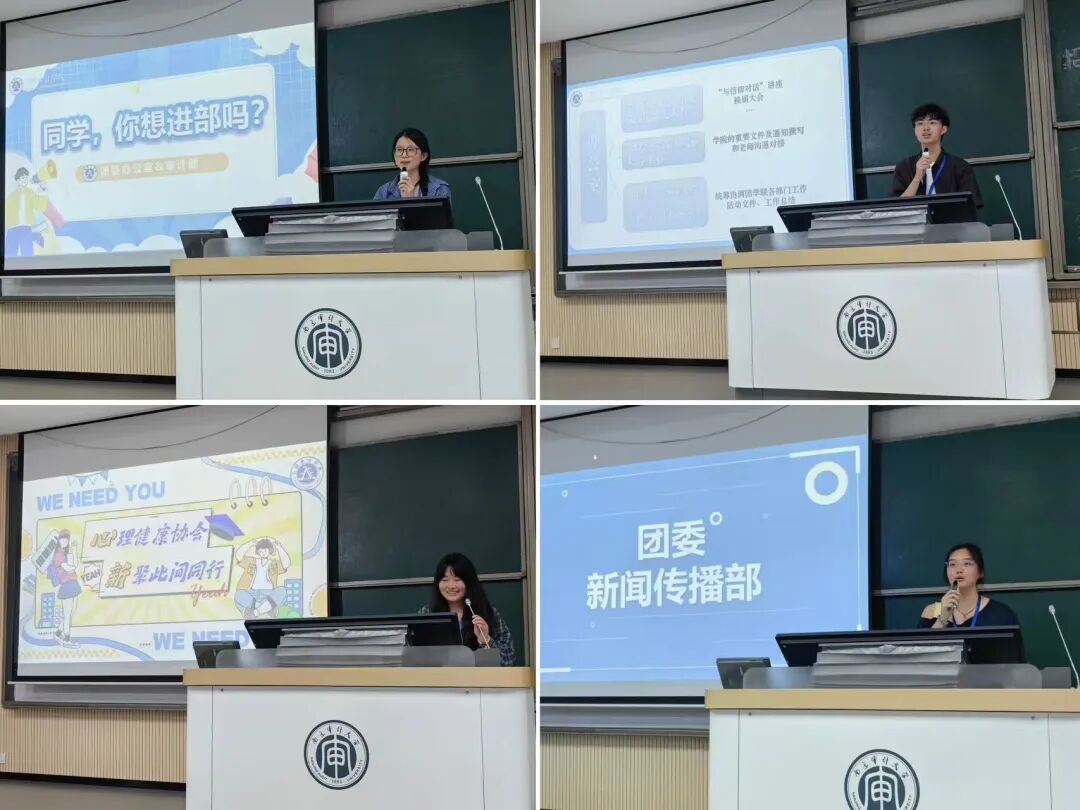 随后的招新宣讲环节,学院团委、学生会、特色学生组织各部门代表依次上台就部门职能及招新要求作了详细介绍,通过PPT展示、现场宣传互动等多种形式,帮助新生深入了解学院学生组织工作,生动展现了学院学生组织的风采与活力。
