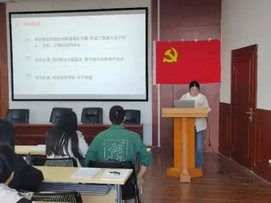 随后吴骞老师上台发言,他首先向新加入支部的党员及按期转正的同志表示了热烈祝贺,并充分肯定了大家过往的表现。接着,他对全体同学提出了殷切期望:一是坚定信念,筑牢思想根基,要持续加强理论武装,深刻领会新时代思想的核心要义;二是勇担使命,发挥先锋作用,希望大家将党员身份内化于心、外化于行,在学术科研、服务同学中亮身份、作表率、当标杆;三是矢志奋斗,书写青春华章,鼓励同学们将个人理想融入时代洪流,在新征程上展现南审青年的担当与作为。