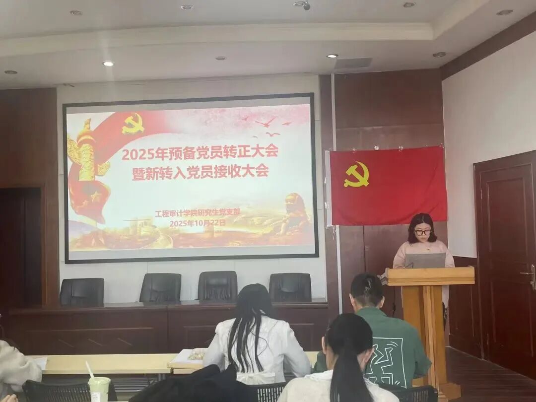 为进一步加强党员队伍建设,2025年10月22日,工程审计学院研究生党支部于春晖厅召开党员大会,接收新入学研一年级正式党员、讨论并表决程豫皖和李俊清两名预备党员的转正申请并围绕习近平总书记系列重要讲话和指示批示精神开展集中理论学习。本次会议由支部副书记袁子淇同志主持,支部党员同志参与。受学院党总支委派,李依璠老师、专职组织员吴骞老师到会指导。