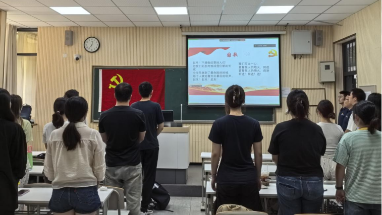 本次党员大会在庄严的《义勇军进行曲》中开始,全体党员起立奏唱国歌。
