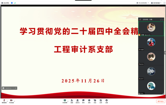 为深入学习贯彻党的二十届四中全会精神,切实将党中央的决策部署融入教育教学一线,11月26日,工程审计系党支部线上组织召开了“学习贯彻二十届四中全会精神,推动工程审计学科高质量发展”专题学习研讨会。会议由支部书记付倩同志主持,全体党员教师参加了本次学习。