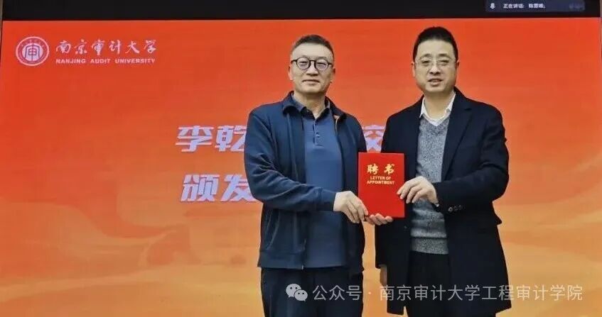 会议举行了江苏省产业教授聘任仪式。中国南水北调集团公司审计法务部主任吴旭东(1987级校友)与江苏希地丰华项目管理集团有限公司董事长、工程审计学院校友联谊会会长张海军(1991级校友)正式受聘为江苏省研究生导师类产业教授。研究生院副院长葛世龙宣读聘任决定后,李乾文副校长为两位校友颁发证书。两位新任产业教授在发言中表达了反哺母校、共创未来的决心。作为重大工程审计法务专家,吴旭东将带来国家级项目实践经验。
