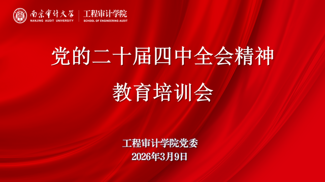 为深入学习贯彻党的二十届四中全会精神、落实学校党委工作要求,切实把思想和行动统一到“十五五”开局之年的战略任务上来,3月9日下午,工程审计学院党委理论学习中心组2026年第3期学习会(扩大)暨党的二十届四中全会精神教育培训会在致明楼709会议室召开。学院领导班子成员、党委委员,各支部、系、科室负责人参加学习,会议由学院党委书记刘玉主持。