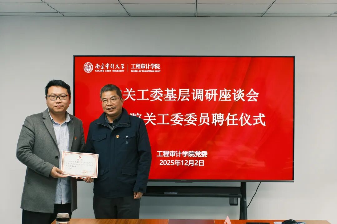 校关工委常务副主任吴朝国在总结讲话中首先向新聘任委员表示祝贺,并指出工程审计学院关工委工作使命特殊、责任重大。他结合自身工作经历,就未来工作提出四点指导意见:第一,课程思政建设要“如盐入水”,自然融入专业教学,让学生懂得“为谁审”,树立职业信仰;第二,廉洁案例库建设要“解剖麻雀”,与纪委、审计部门协同,打造精深的警示教育资源;第三,青年师生廉洁教育要深化“双向赋能”,既传承审计精神,也引入新技术新方法,并对青年教师履行“人师”职责提出明确要求;第四,纪法意识培养要践行“知行合一”,通过情景模拟、主题活动等方式,让敬畏与践行深入人心。他表示,今天颁发的不仅是聘书,更是责任书,希望工程审计学院关工委将“廉洁”二字刻进品牌、融入血脉,校关工委将全力支持学院培育更多工程审计铁军。